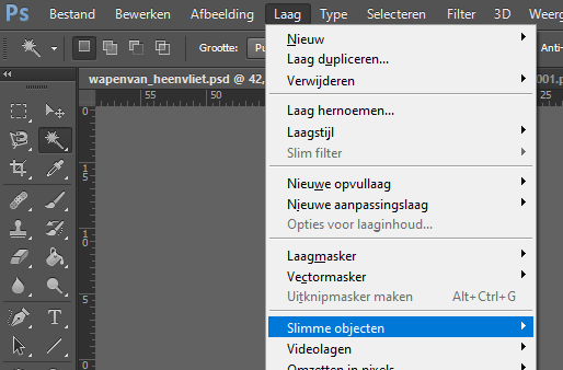 - Maak grote foto een ‘Smart object’ (Rechts klikken op laag)