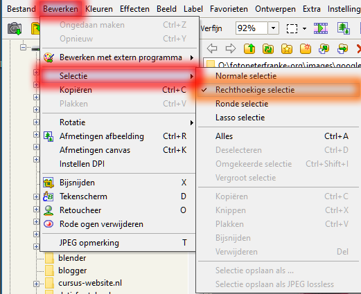 - Kies dan in het menu: Bewerken - Selectie - Rechthokige selectie