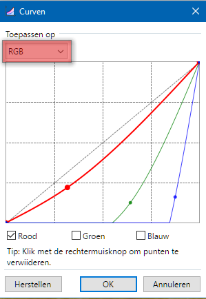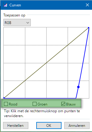 - Zet de vinkjes bij Rood en Groen uit en sleep de blauwe lijn zoals in onderstaand voorbeeld.